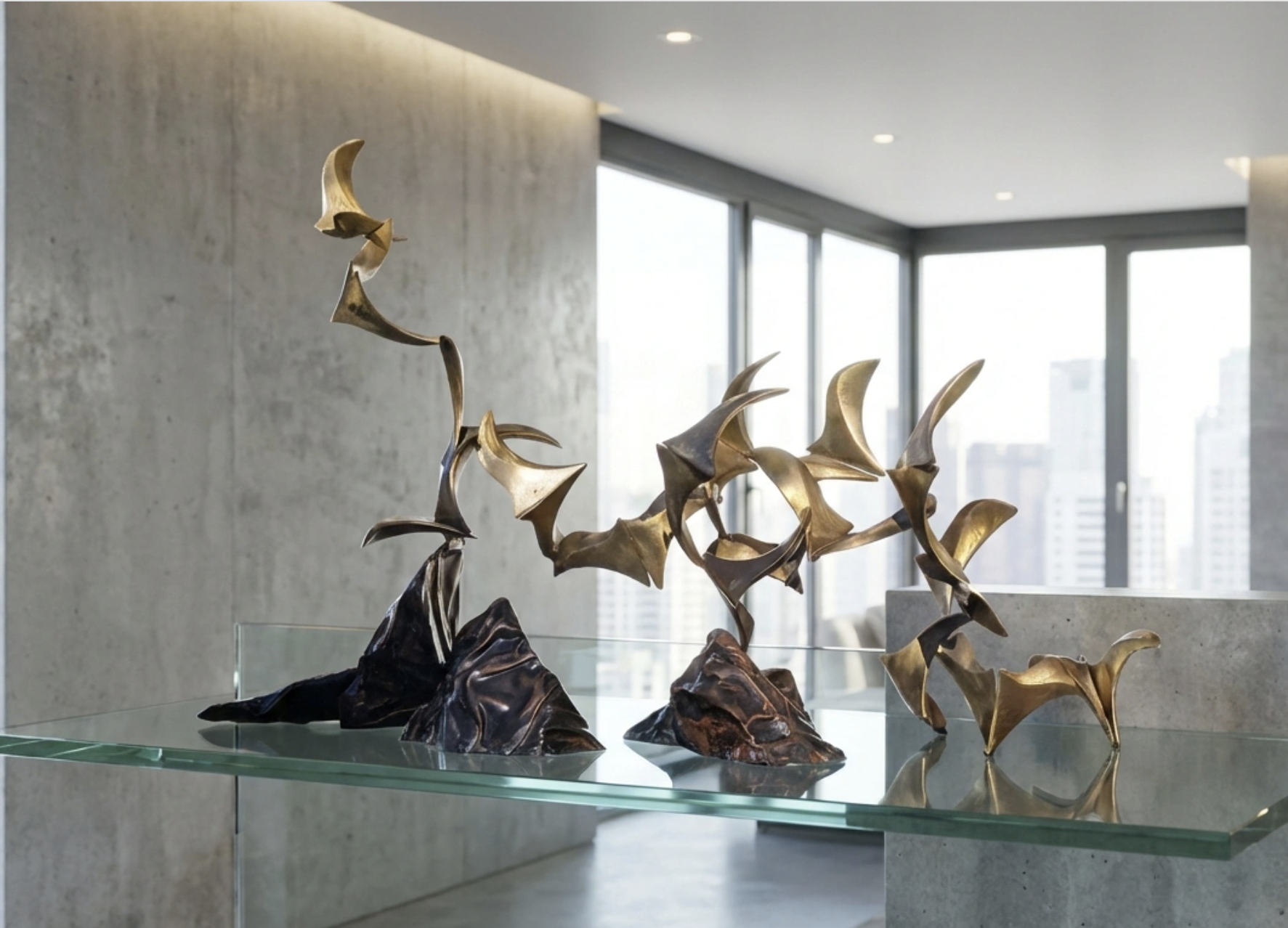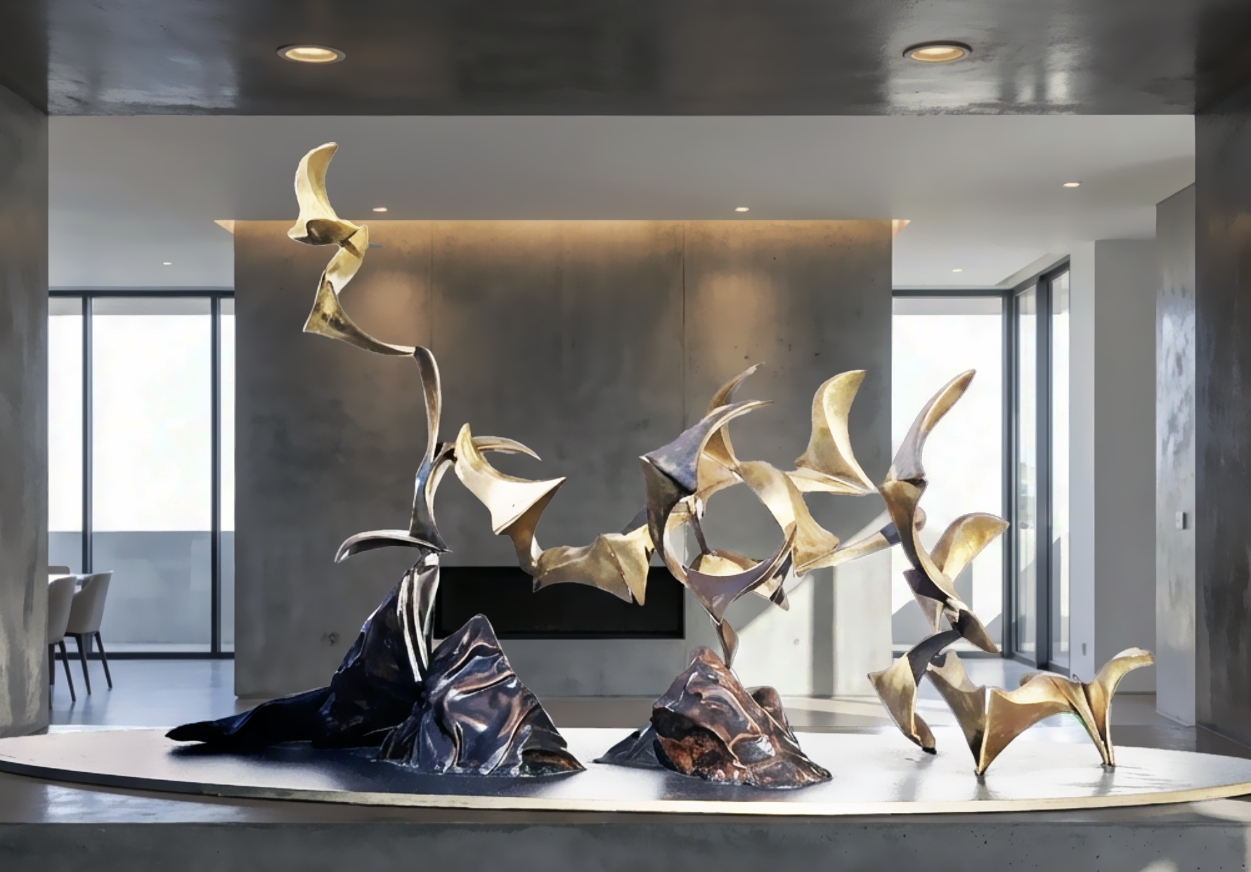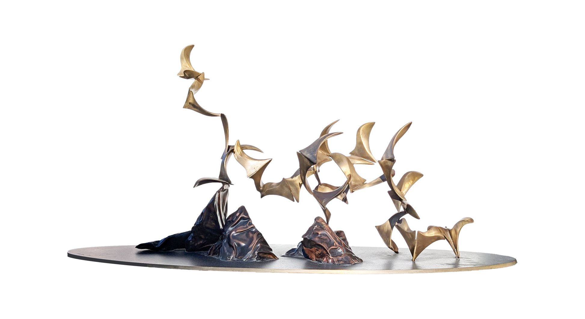 Imagine a flock of seventeen feathered companions breaking free from their stony perch, dancing through the air in a graceful, rhythmic ballet. Dimensions of this unique sculpture, including the oval base, are 18" high x 36" long x 13" wide.