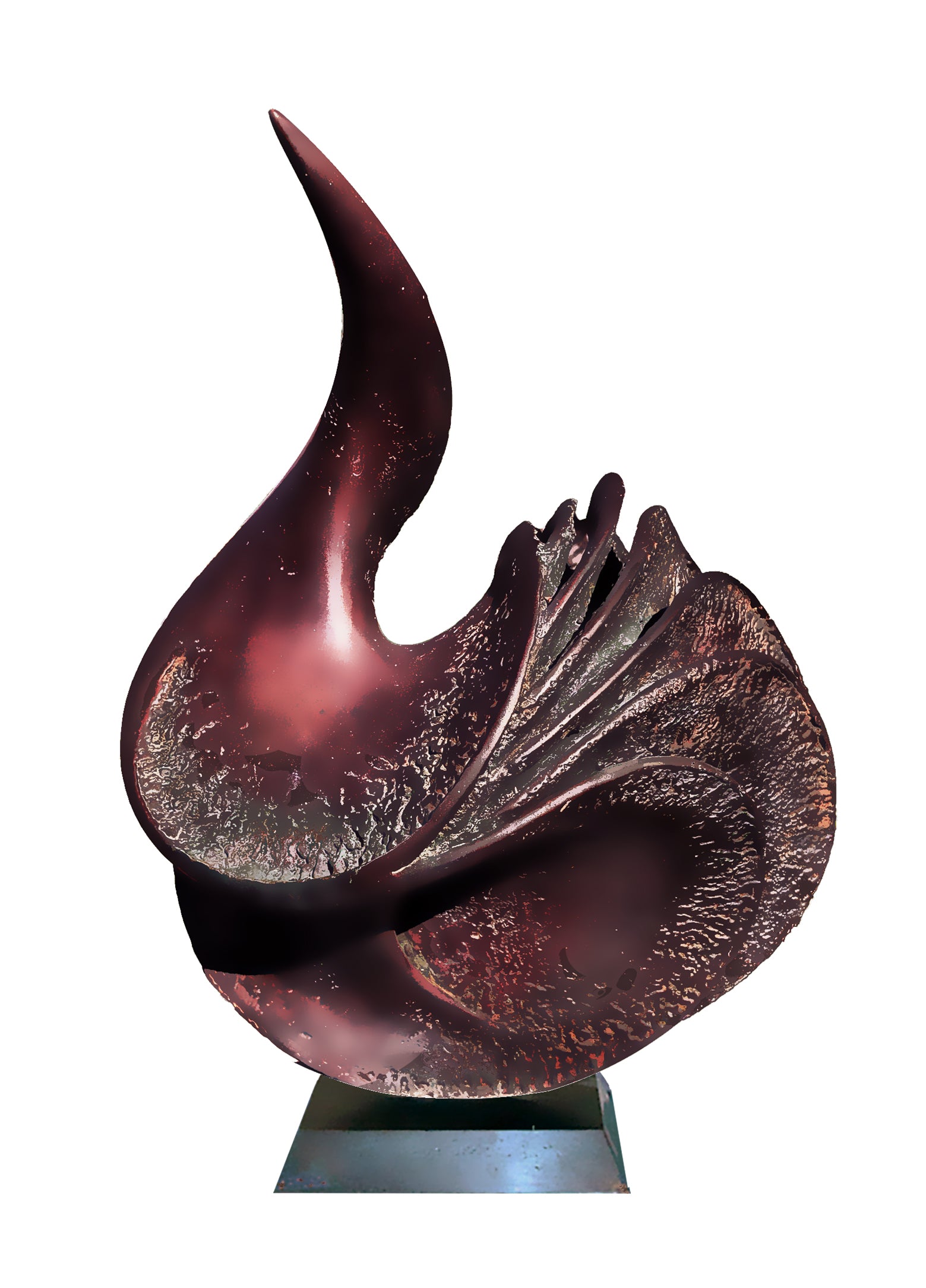 Inspired by the Devonian period's remarkable marine biodiversity, this cast bronze sculpture reimagines the extinct ammonite—a creature that dominated Earth's oceans for over 300 million years before vanishing in the same cataclysm that claimed the dinosaurs. Today, only the Nautilus carries forward their ancient lineage. Rendered in luminous magenta-hued patina, this imaginative interpretation captures the elegance of these vanished mollusks. Standing 25.5" high, 20" wide, and 12" deep, it serves as a striking tribute to prehistoric wonder.