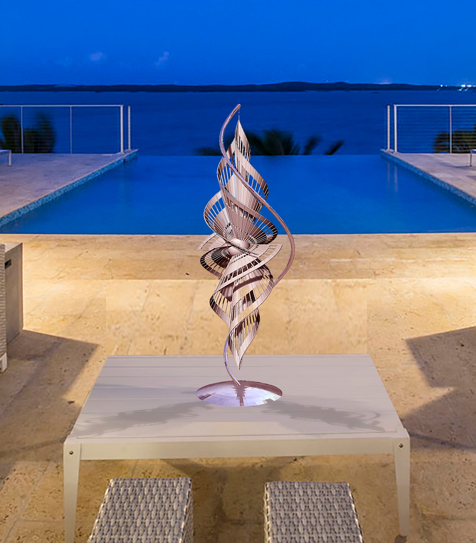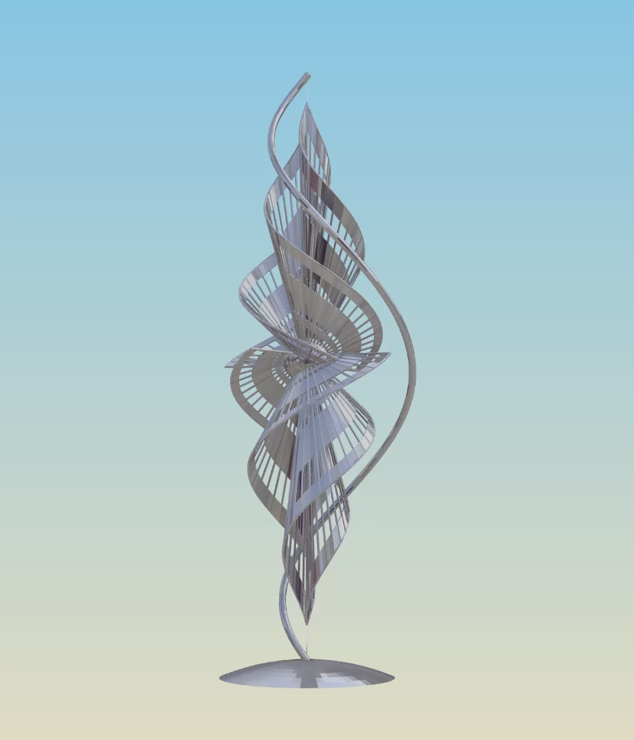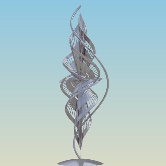 This piece is a mesmerizing study in helical geometry and intricate design. At the core resides a sphere around which revolves a continuum of spiraling surfaces, evoking an otherworldly sense of a nebula or microscopic diatom. It's a hypnotic exploration of endless recursion where smaller spirals nest within larger ones, creating infinite complexity in a finite space.