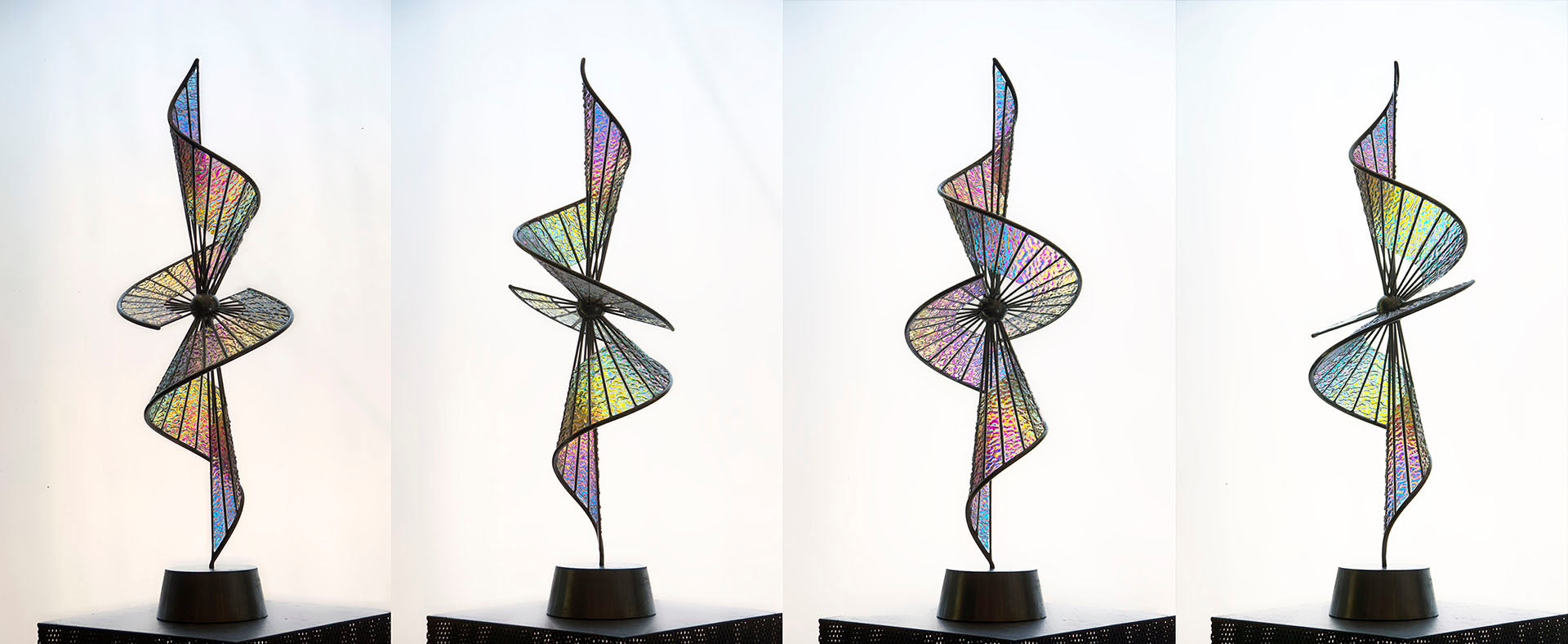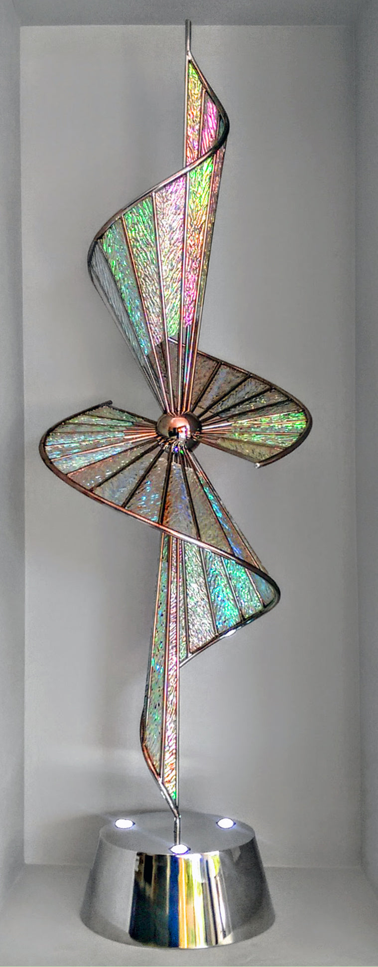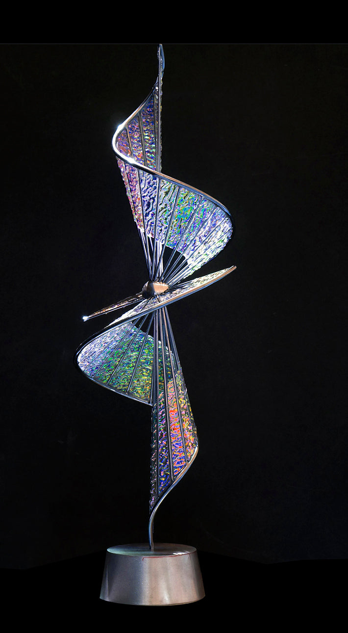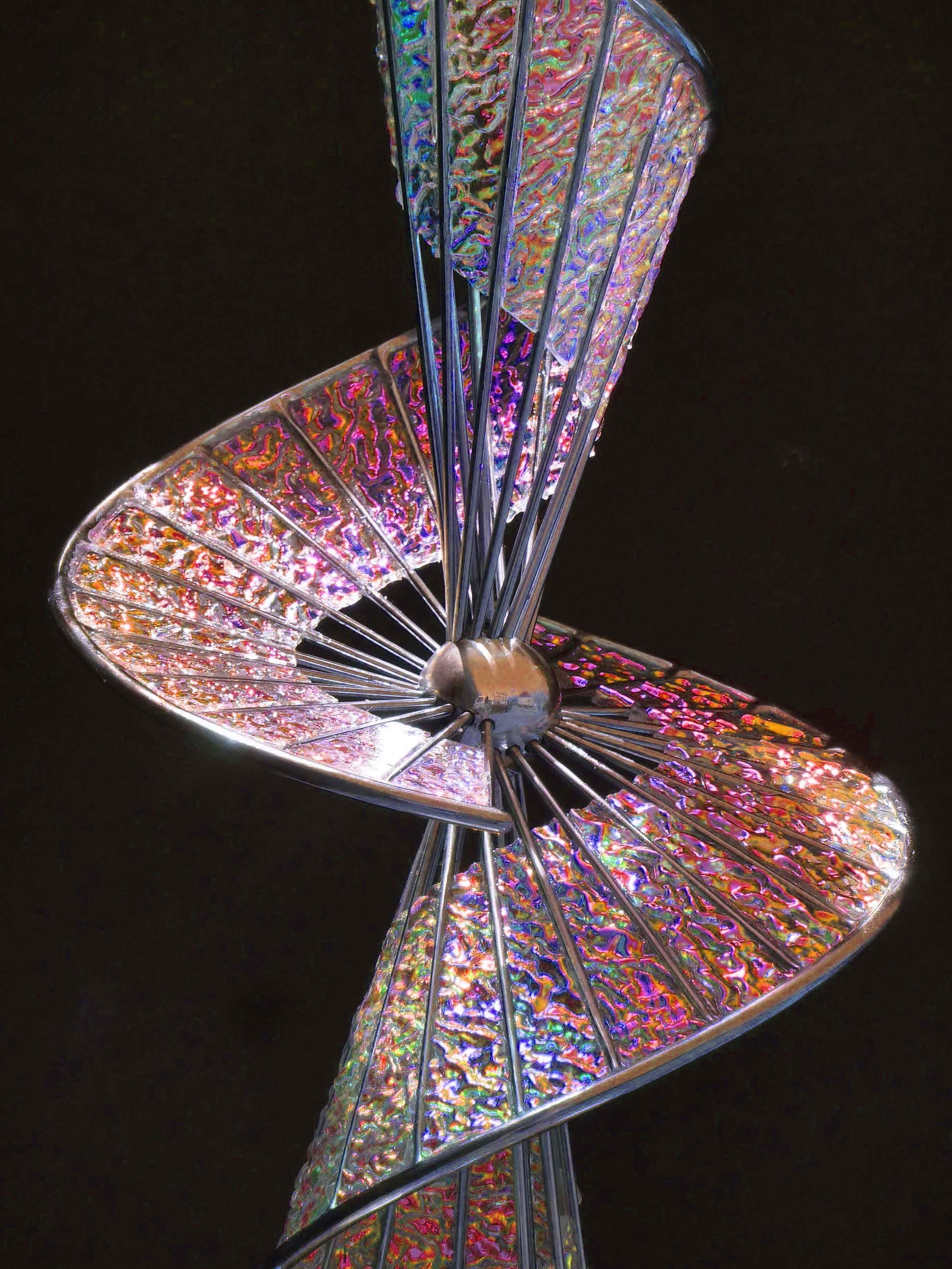 This is a limited edition of 10. It is available in your choice of dichroic glass textures and colors. This piece requires a 10 week lead time to create. Please give us your info on the contact page so I can call or email you to discuss your preferred suspension orientation and choice of dichroic glass colors before purchasing.
