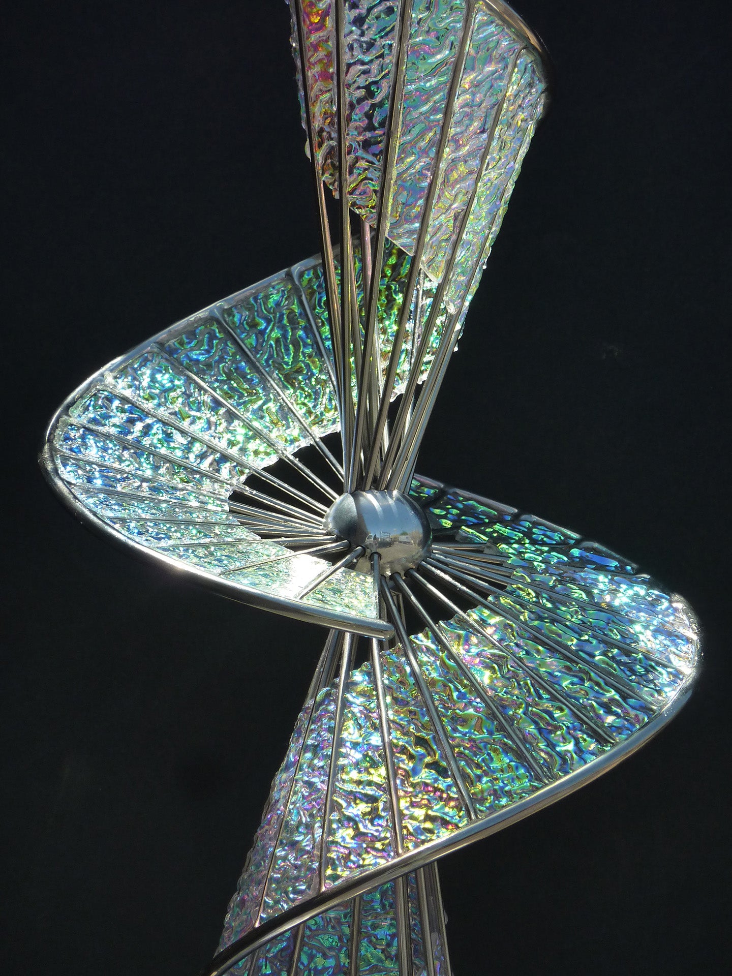 Aurora is a mirrored spiral anchored to a stainless steel sphere. It's cosmological aura reveals a 3 planar section of a 4 dimensional object in 3 dimensional space.