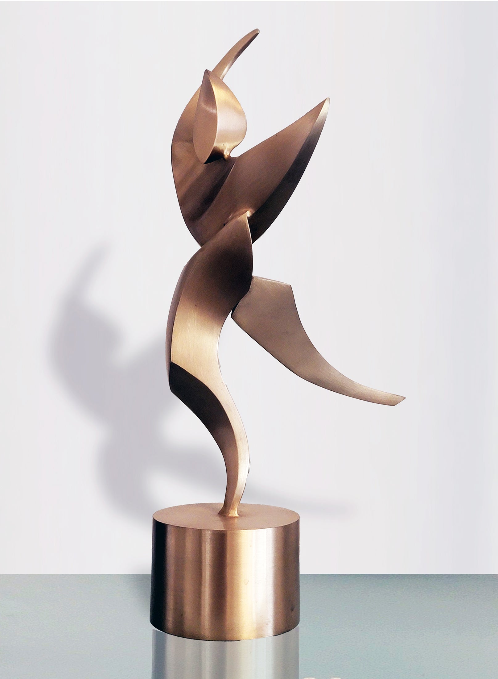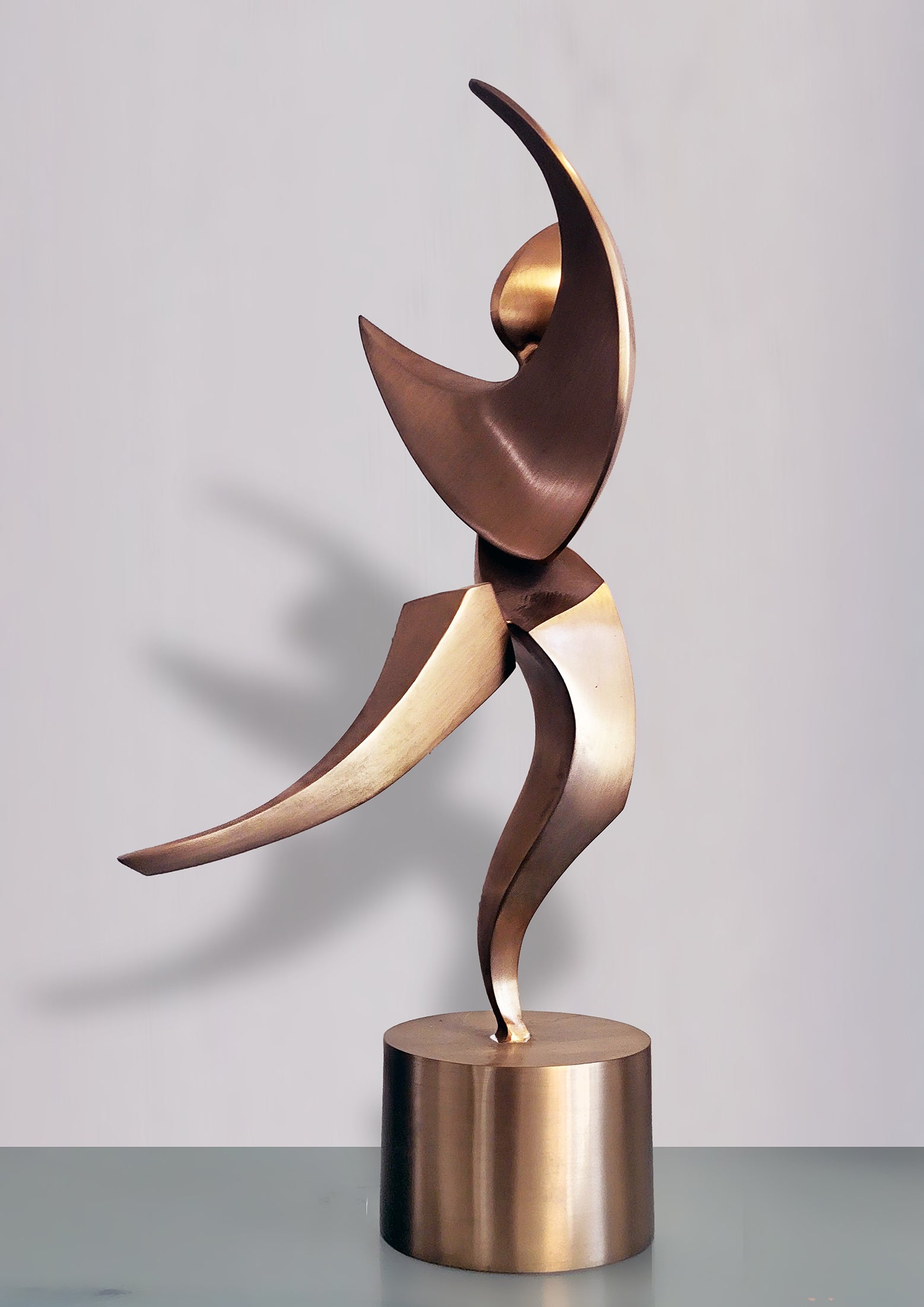 This conceptualization evokes a dancer caught in a moment of balanced stillness, embodying their fluid and graceful movements. The bronze casting is available in a natural brushed finish with clear coat or in magenta-blue color shifting paint. Dimensions are 17" high x 6" deep x 8" wide