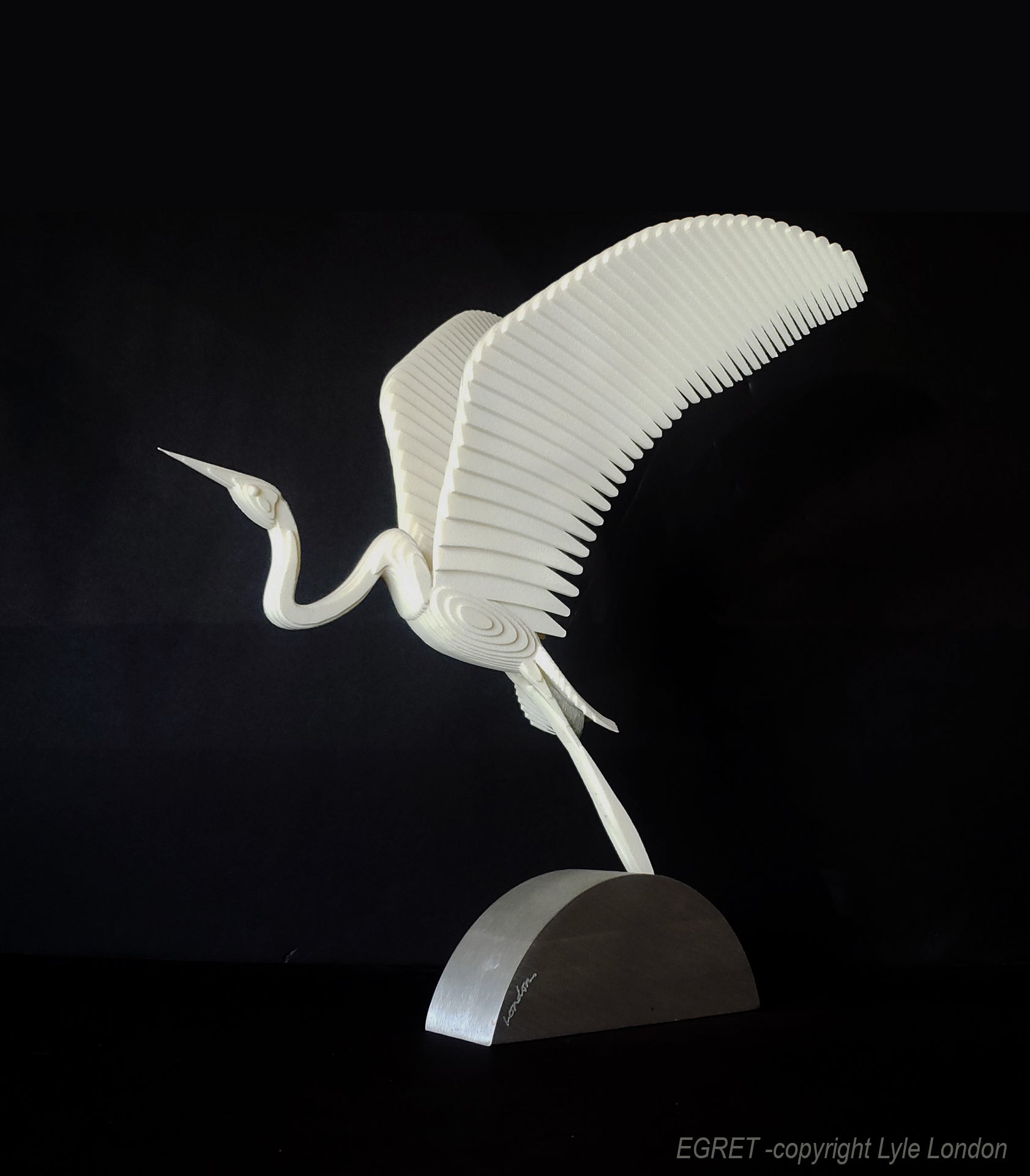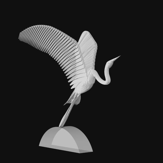 Created as my model for a monumental 14-foot Corten steel piece I installed at the Lakes of Tempe. The piece captures the graceful essence of its subject through art deco geometry. The 3D-print can be ordered 14" or 18" high. Available in pristine white or warm metallic bronze. Its streamlined form distills the bird's elegant silhouette into a timeless design language, making it an understated yet striking accent for discerning collectors. Includes base. Dimensions: 14"H x 9.5"W x 13"D.