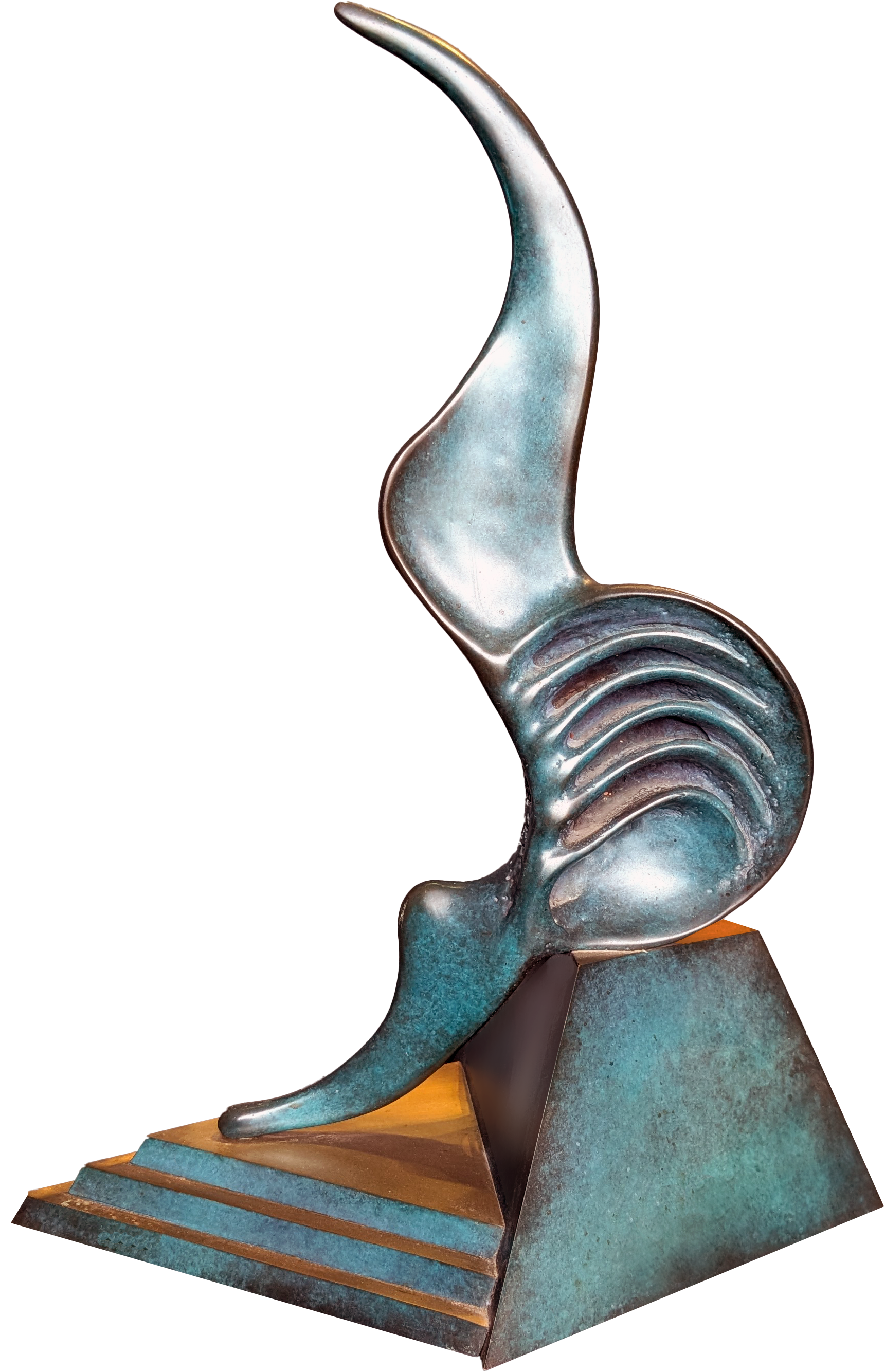 A one-of-a-kind bronze sculpture born from the artist's experimental mid-80s technique: stretching lycra over copper wire, dipping in foundry wax, hand-tooling with flame, then casting. No molds, no repeats—just raw creative alchemy frozen in bronze. Each piece tells the story of its own making. Dimensions are 23" high x 19" long x 10" deep.