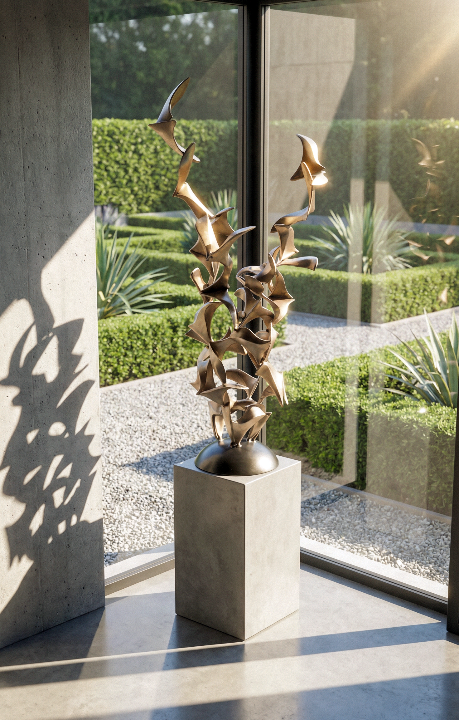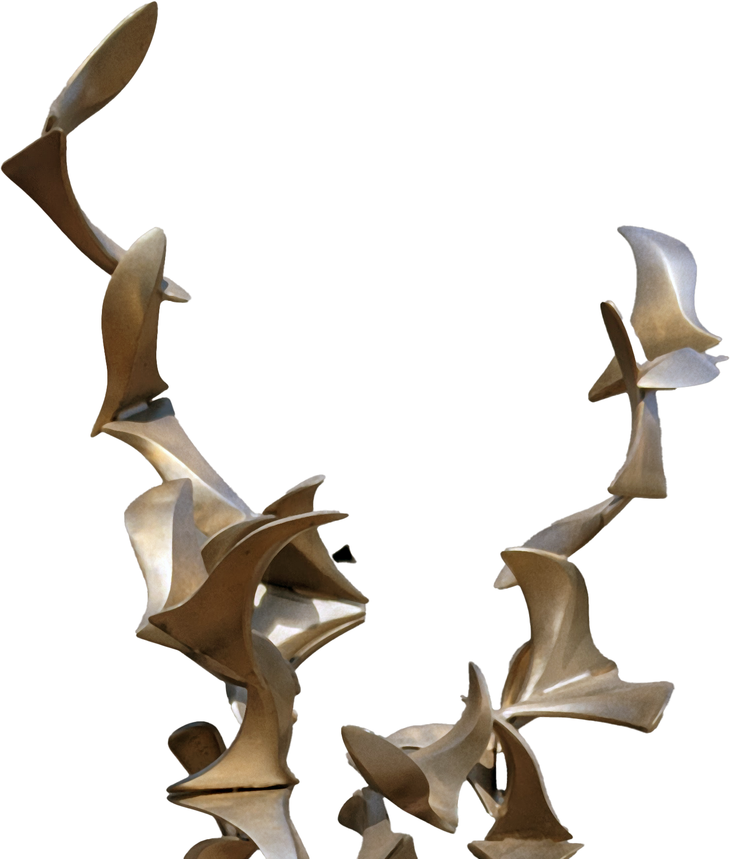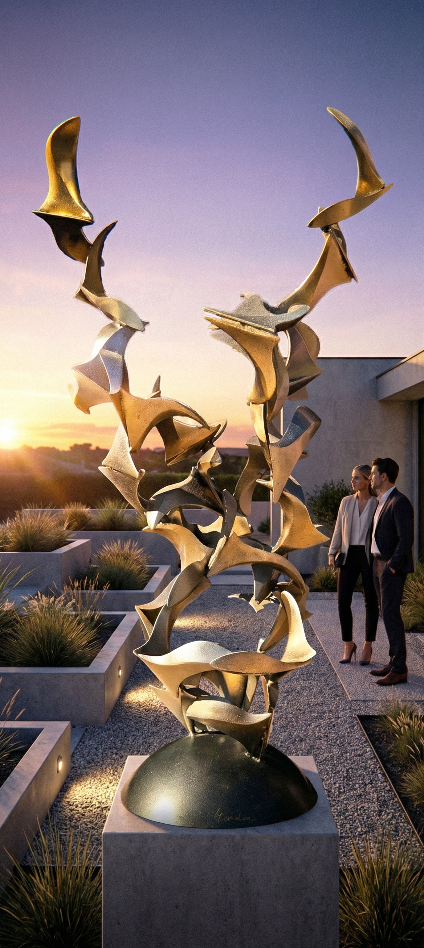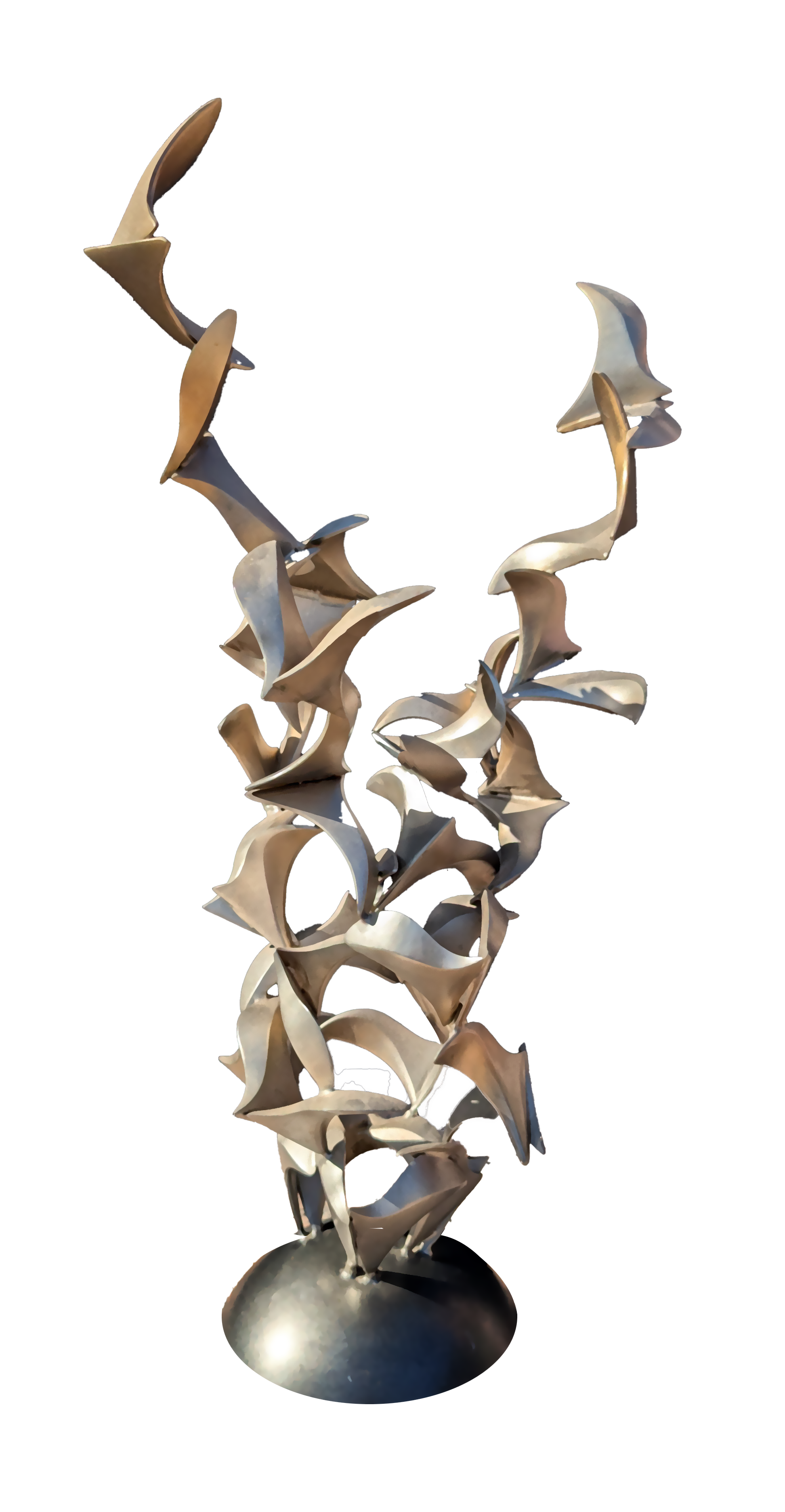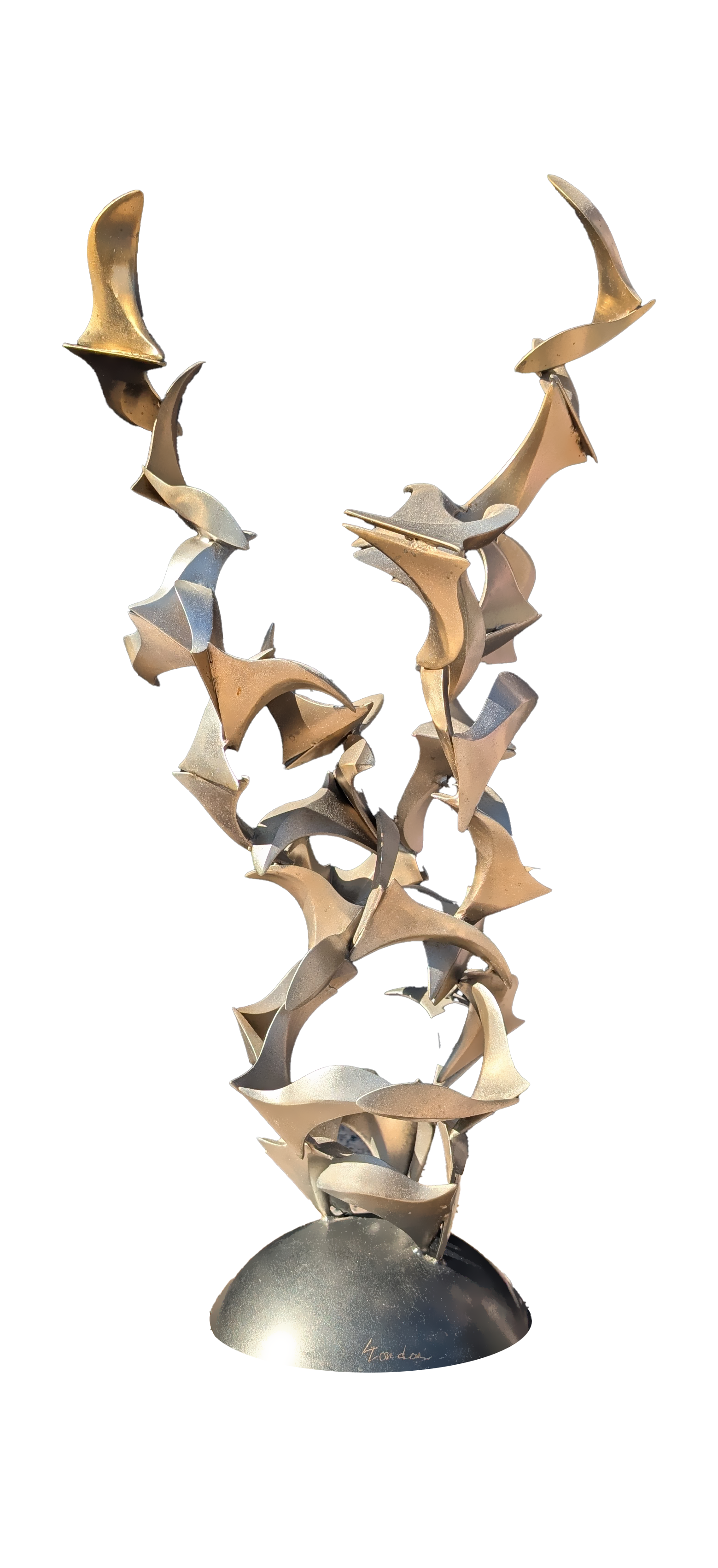 SOARING captures the essence of upward momentum in gleaming bronze. This sculptural piece depicts birds exploding upwards in flight, their forms frozen mid-ascent with graceful, sweeping lines. This piece projects coordinated action from every view. Perfect for collectors who appreciate nature-inspired art with a sense of freedom and vitality. A striking statement piece that brings life and lightness to any space. This is a one of a kind sculpture; dimensions are 26" high x 12" x 12"
