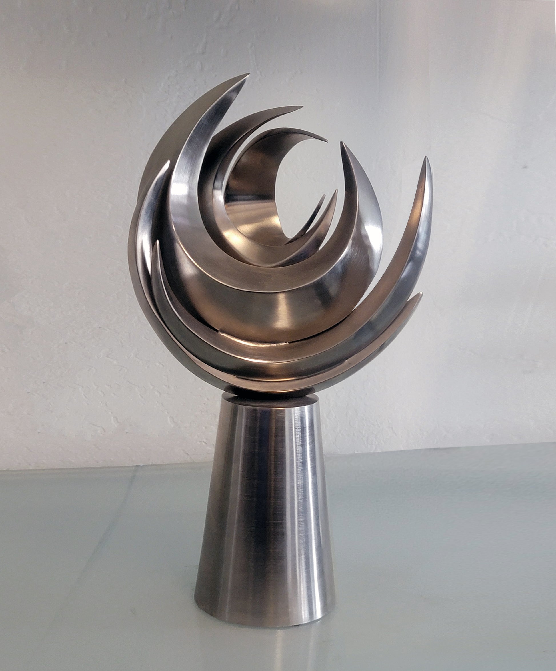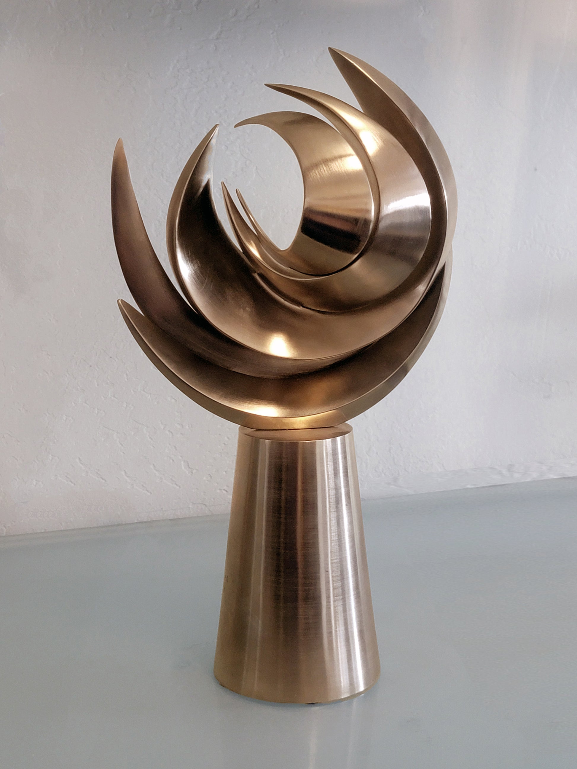 WAVE captures the harmonic forms of a liquid wave in a 3D freeze frame. The sculpture is cast bronze in an edition of 12 and is available in brushed nickel or brushed bronze. Dimensions are 13" high x 7" wide x 4" deep.